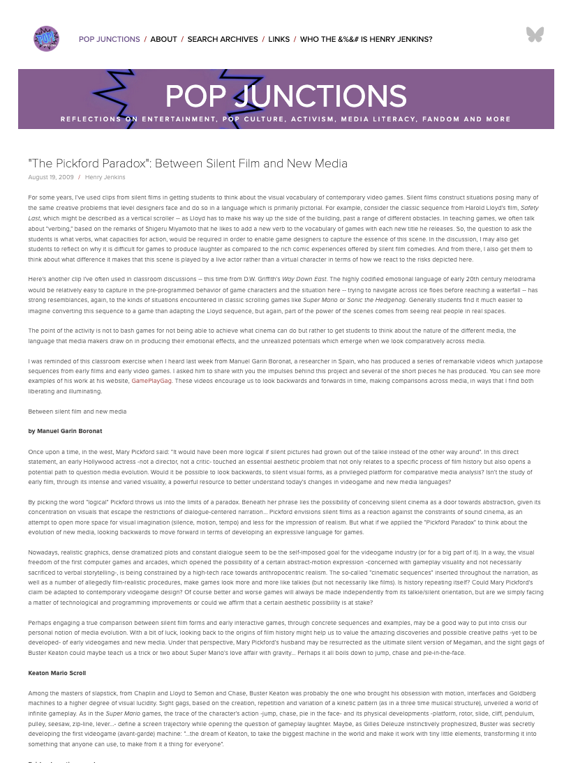 The Pickford Paradox: Between Silent Film and New Media Blog Entry in “Confessions of an Acan-Fan, The Official Weblog of Henry Jenkins”, 2009 / in English