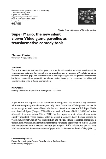 Super Mario, The New Silent Clown. Video Game Parodies as Transformative Comedy Tools Article in International Journal of Cultural Studies, 2015 / in English